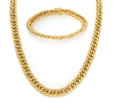 consisting of a matching curblink necklace and bracelet with alternating polished and textured links.Stamp: 750 BREV (maker's mark).