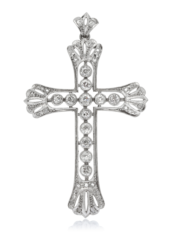 containing 12 old mine cut diamonds weighing approximately 1.02 carats total and numerous rose cut diamonds, the openwork pendant measuring approximately 50.00 x 35.00 mm excluding bail.