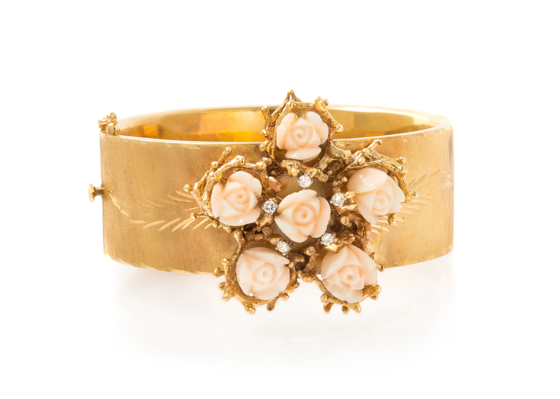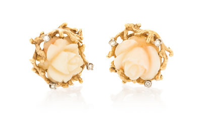 A Collection of Yellow Gold, Carved Coral and Diamond Jewelry,