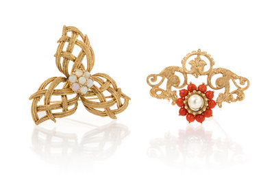 consisting of a gold brooch in a leaf woven design containing seven round cabochon cut opals measuring approximately 3.50 mm in diameter and one gold brooch containing one cultured pearl measuring approximately 6.07 mm in diameter surrounded by 10 round cabochon cut coral measuring approximately 4.00 mm in diameter.Stamp: 14K (hallmark).