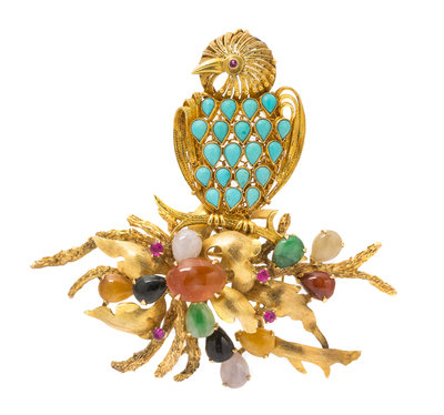 depicting a bird perched upon a branch with leaves, containing numerous pear shape cabochon cut turquoise, five round mixed cut rubies, and 10 oval and pear shape cabochon cut jade in mottled yellow, orange, green and black hues, brooch measures approximately 75.00 x 72.00 mm.