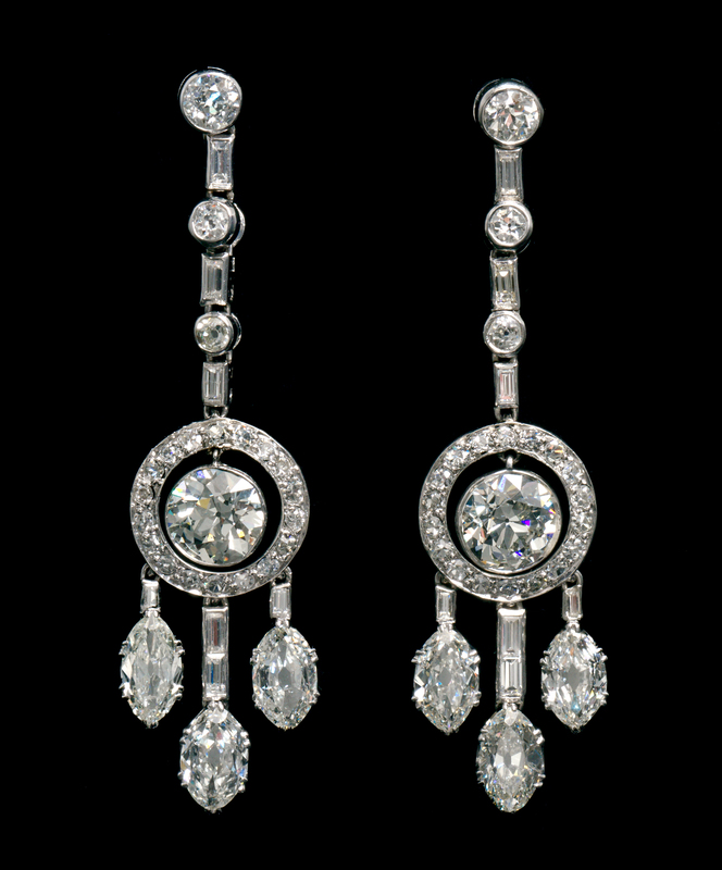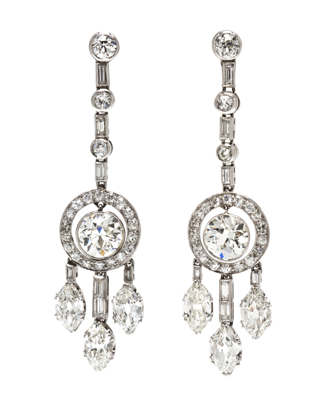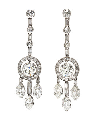consisting of vertical drops composed of bezel set stones suspending open circlets with center accent, the circlets each supporting three pendants, containing two old European cut diamonds weighing approximately 1.38 carats and 1.42 carats respectively, six antique marquise cut diamonds weighing approximately 2.60 carats total, 14 baguette cut diamonds weighing approximately 0.70 carat total, six old European cut diamonds weighing approximately 0.74 carat total and 36 old European and single cut diamonds weighing approximately 0.64 carat total.