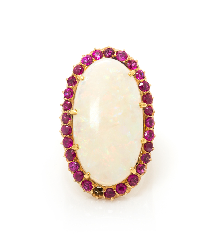 containing one oval buff top cabochon white opal measuring approximately 25.40 x 14.61 x 3.25 mm and 28 round mixed cut rubies weighing approximately 1.26 carats total.