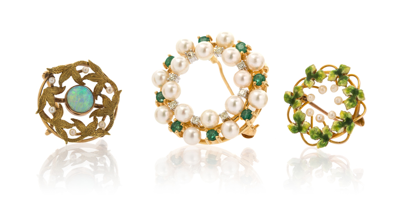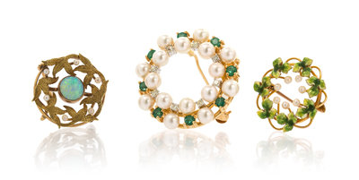 consisting of one Art Nouveau style pendant/brooch containing one round cabochon cut opal measuring approximately 6.75 mm in diameter and six seed pearls, one leaf motif brooch with green enamel and seven seed pearls and one 14 karat gold circular brooch containing 16 cultured pearls measuring approximately 4.53 mm in diameter, 16 round brilliant cut diamonds weighing approximately 0.24 carat total and eight round cut emeralds.