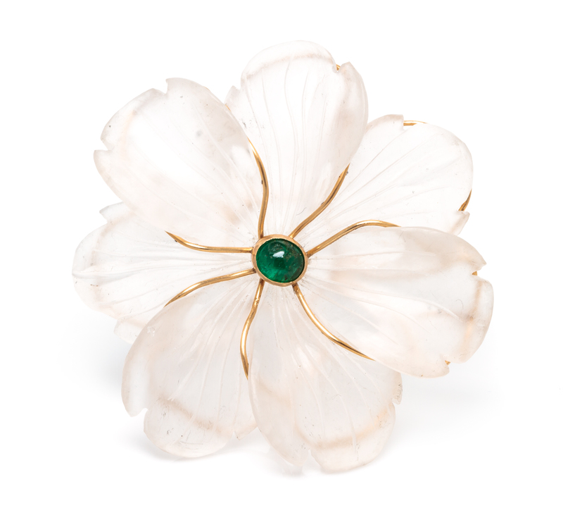 consisting of a frosted rock crystal carved in the form of a flower containing one oval cabochon cut emerald measuring approximately 6.11 x 5.34 mm.
