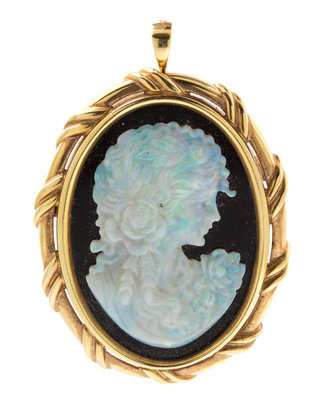 A 14 Karat Yellow Gold, Opal and Onyx Cameo Pendant/Brooch,