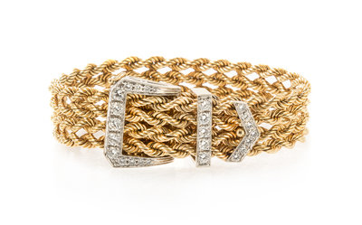 A 14 Karat Gold and Diamond Belt Motif Bracelet,