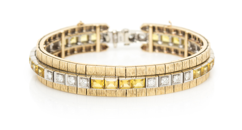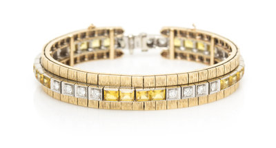 containing 20 round brilliant cut diamonds weighing approximately 1.25 carats total and 20 rectangular step cut synthetic yellow sapphires, fitted bracelet jacket with a Florentine finish.Stamp: 14K.
