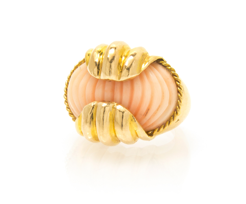 containing an oval carved and fluted pink coral set within a ribbed and rope textured setting.Stamp: 14K.