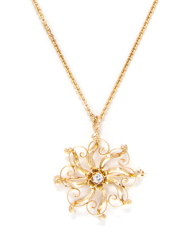 A 14 Karat Yellow Gold and Diamond Pendant/Brooch Necklace,