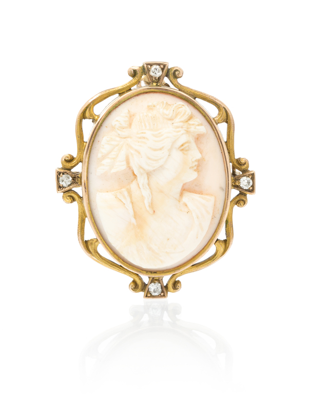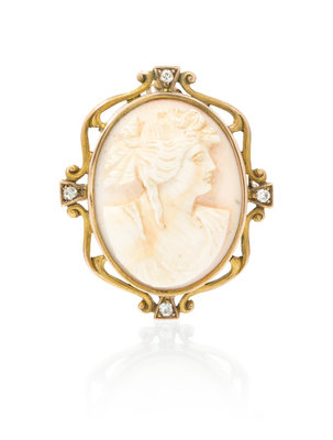 An Art Nouveau 10 Karat Yellow Gold, Shell Cameo and Diamond Pendant/Brooch,