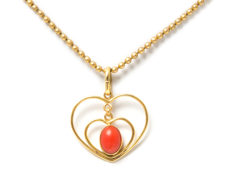 consisting of heart shape pendant containing an oval cabochon cut coral measuring approximately 5.45 x 7.48 mm, suspended from a ball chain.