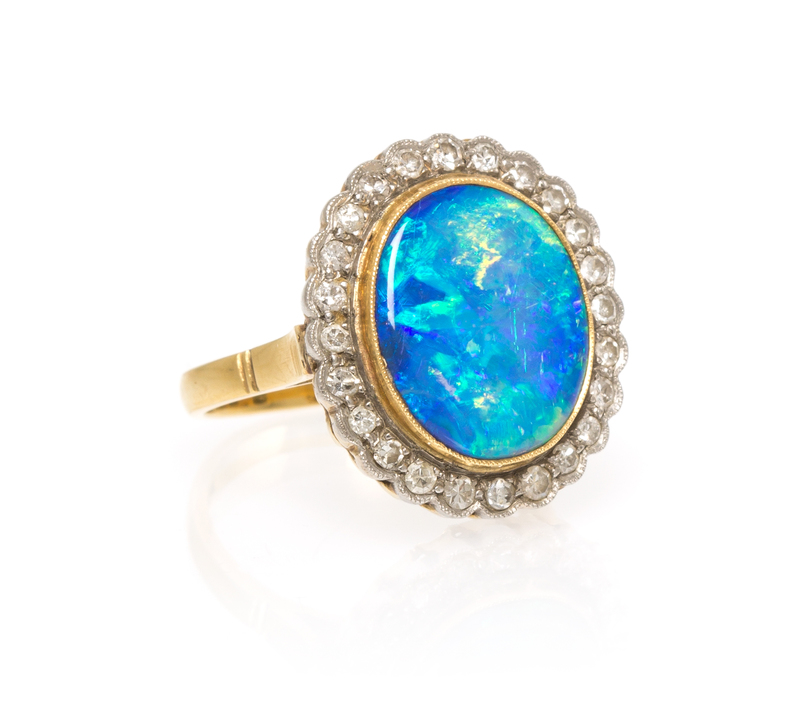 containing one oval buff top opal measuring approximately 14.00 x 12.00 x 3.00 mm and 24 single cut diamonds weighing approximately 0.72 carat total.Stamp: 18ct.