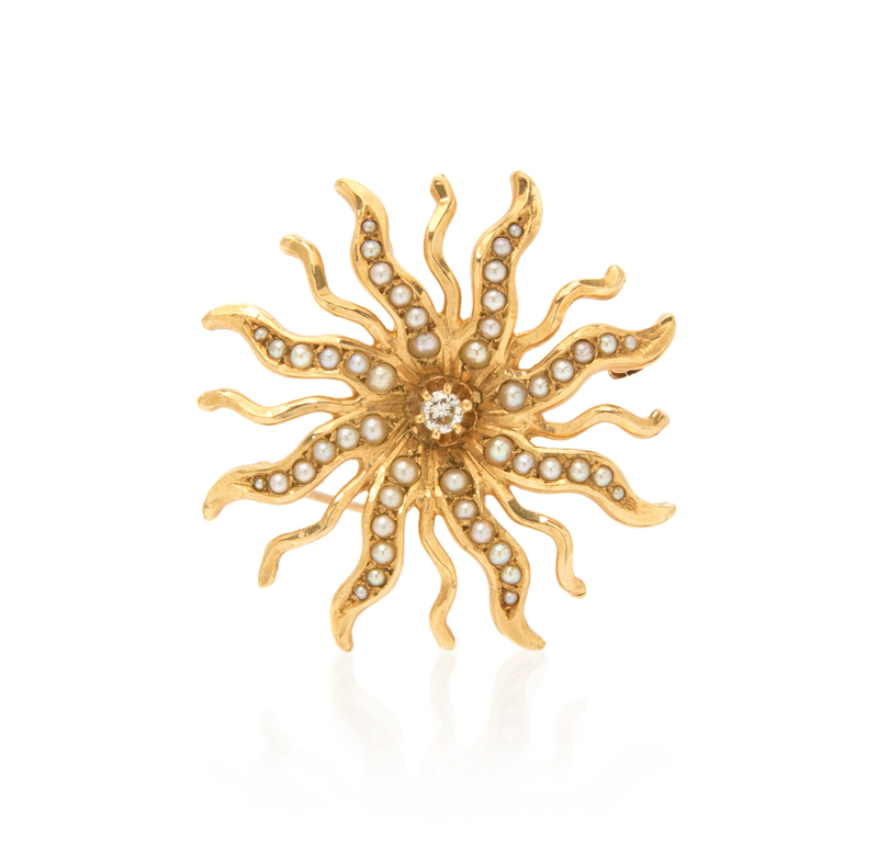 A 14 Karat Yellow Gold, Diamond, and Seed Pearl Sunburst Brooch,