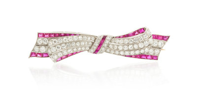 An Art Deco Platinum, Ruby, Synthetic Ruby and Diamond Bow Brooch,