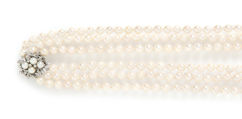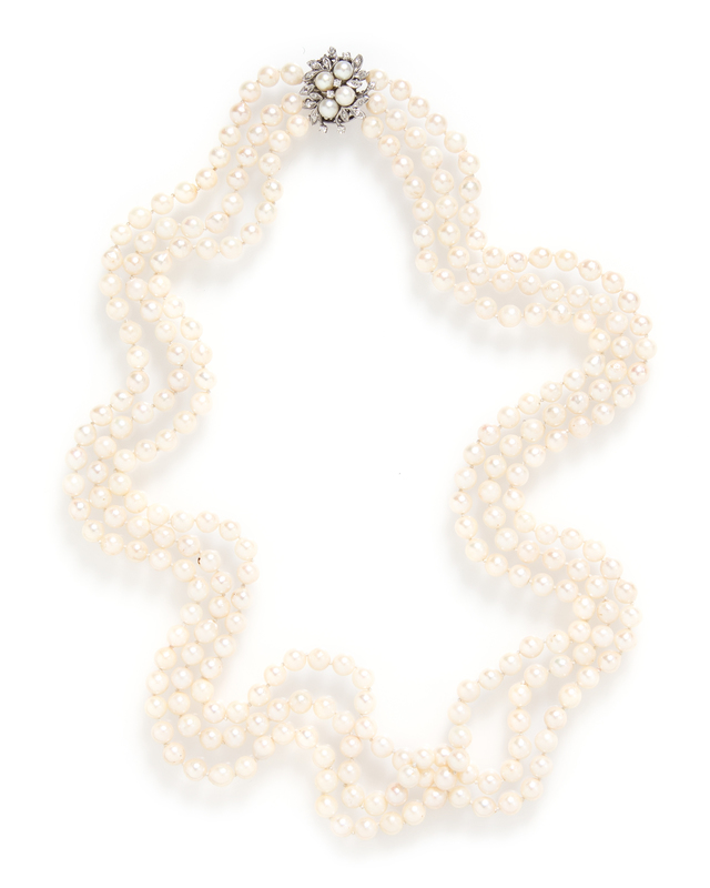 consisting of graduated triple strand necklace containing 271 pearls measuring approximately 7.35-7.91 mm in diameter, strung knotted with a white gold clasp containing four cultured pearls and 20 round brilliant and single cut diamonds weighing approximately 0.41 carat total.