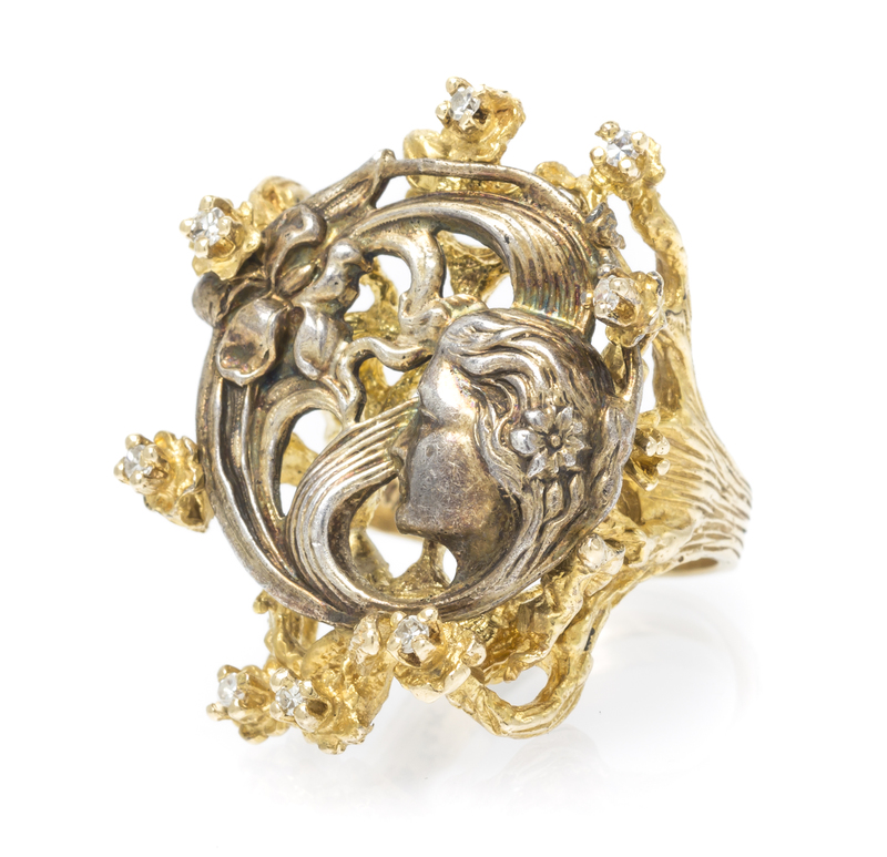 consisting of a central openwork silver plaque depicting a maiden withflowing hair and a floral accent set within a textured wirework settingcontaining eight round single cut diamonds weighing approximately 0.24 carat total.