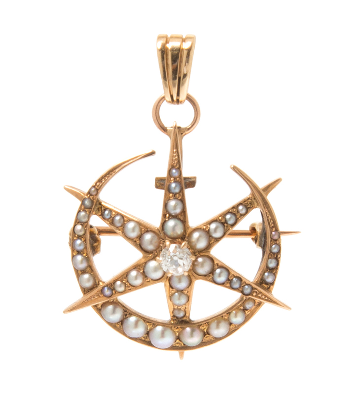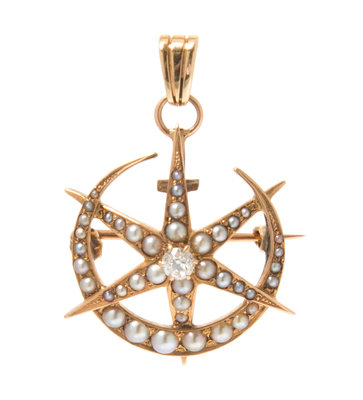 consisting of a star and crescent motif, containing one old mine cut diamond weighing approximately 0.13 carat and numerous seed pearls.