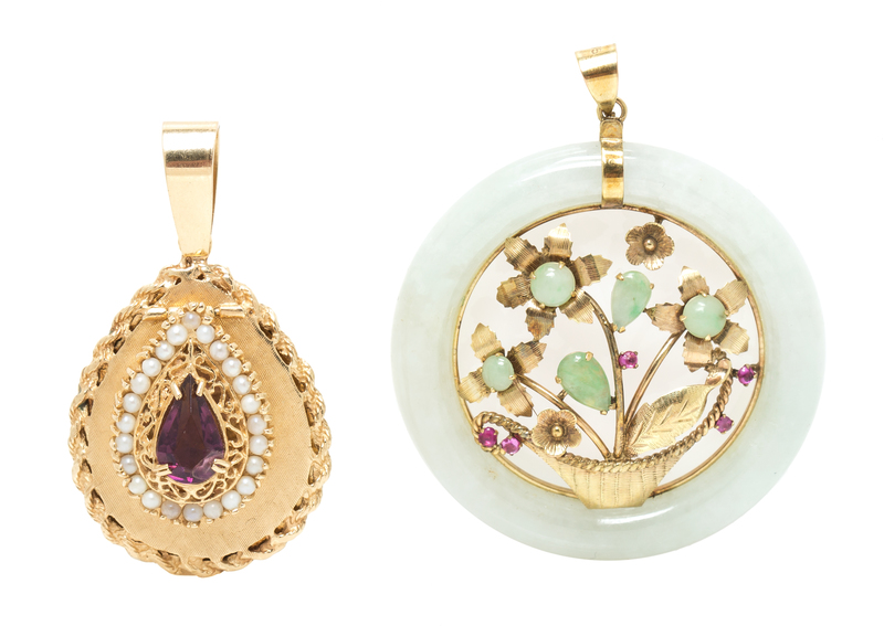 consisting of a 9 karat yellow gold floral basket motif containing two pear and round shape cabochon cut jade and five round cabochon cut pink sapphires suspended within a jade ring, together with a 14 karat yellow gold pear shape pendant containing one pear shape single cut amethyst and 24 seed pearls.