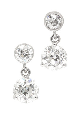 containing two prong set old European cut diamonds weighing approximately 1.44 carats total suspended from two bezel set old European cut diamonds weighing approximately 0.33 carat total. Stamp: 14K.