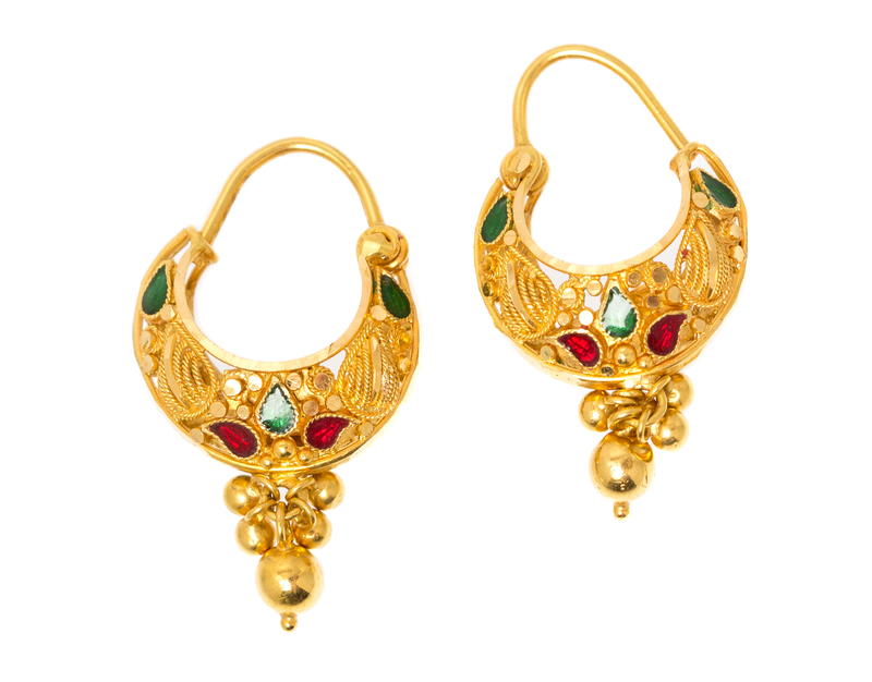 with applied twisted wire and granulation designs accented with red and green enamel paisley shapes, attached gold balls at base.Stamp: DIP (maker's mark).