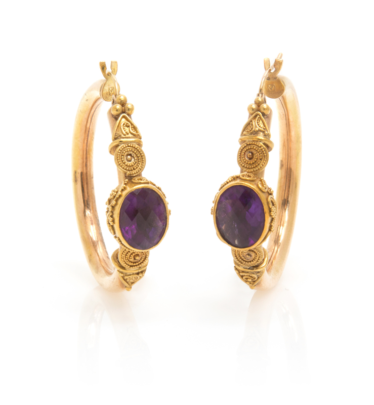 A Pair of Yellow Gold and Amethyst Hoop Earrings,