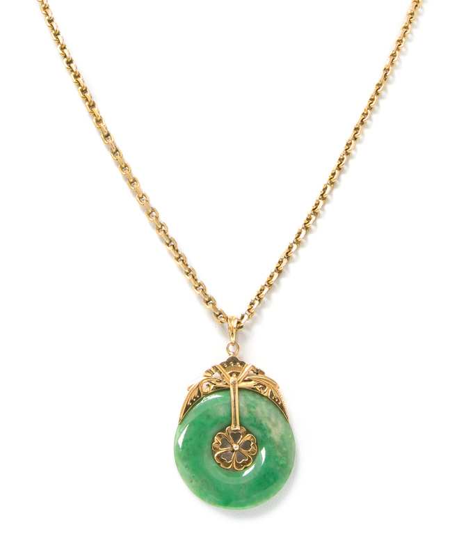 consisting of a green jade bi measuring approximately 1 inch in diameter suspended from an engraved foliate frame and chain.