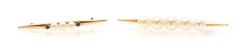 consisting of one bar brooch containing five round pearls measuring approximately 6.45-7.19 mm in diameter and one bar brooch containing three round pearls measuring approximately 4.02-4.22 mm in diameter and two round cut sapphires weighing approximately 0.14 carat total. Stamp: K14.