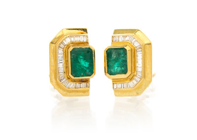 A Pair of Yellow Gold, Emerald and Diamond Earclips,