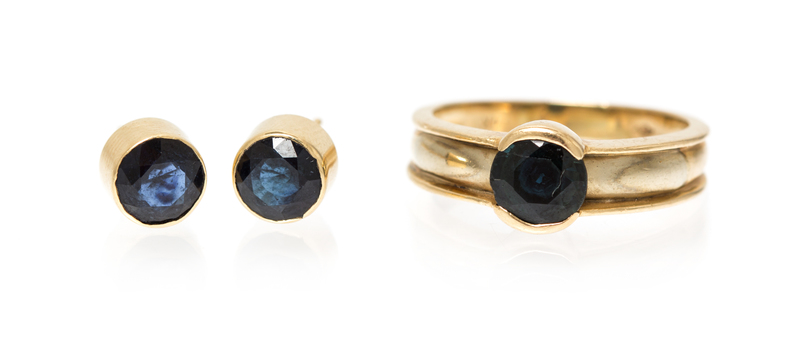 consisting of a solitaire ring containing one round mixed cut sapphire weighing approximately 1.50 carats and a pair of ear studs containing two round mixed cut sapphires weighing approximately 2.35 carats total.Stamp: 14K.