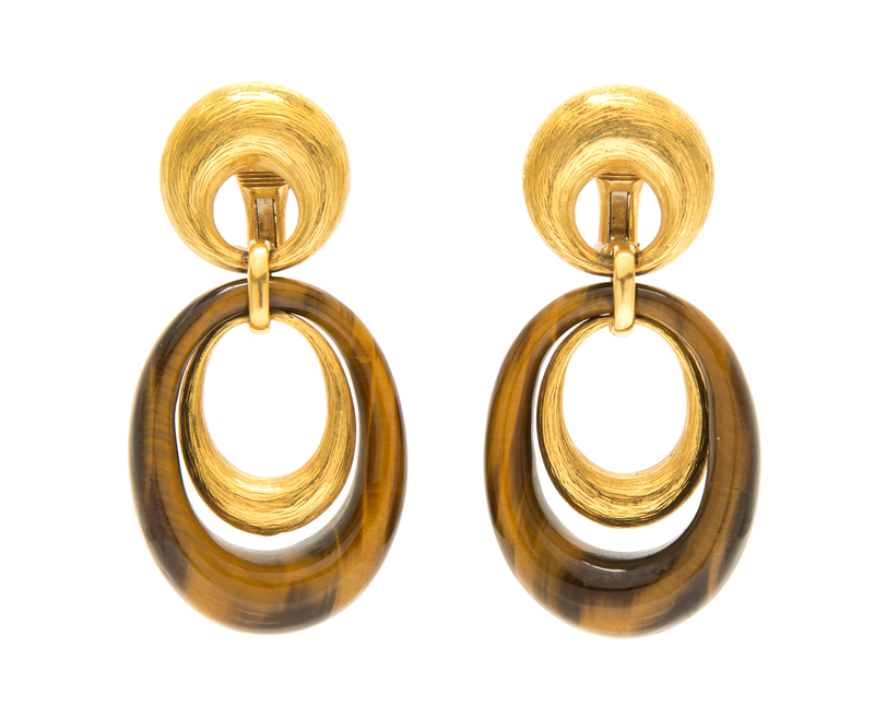 A Pair of 18 Karat Yellow Gold and Tiger's Eye Doorknocker Earclips,