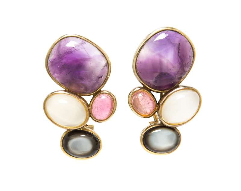 A Pair of Gilt Silver, Amethyst, Cat's Eye Moonstone, Tourmaline and Mother-of-Pearl Earclips, KYLO,