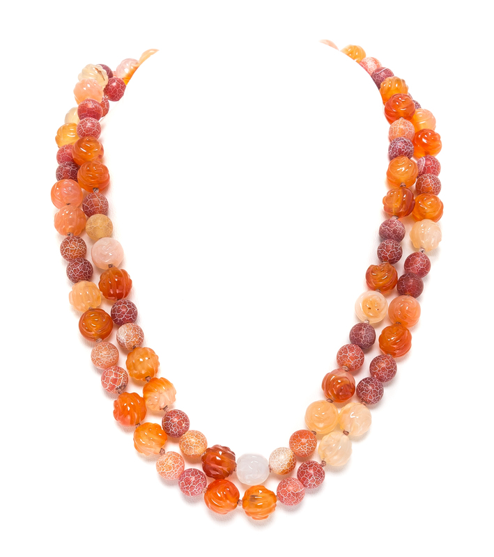 containing alternating agate and carved carnelian beads. Stamp: 14K.