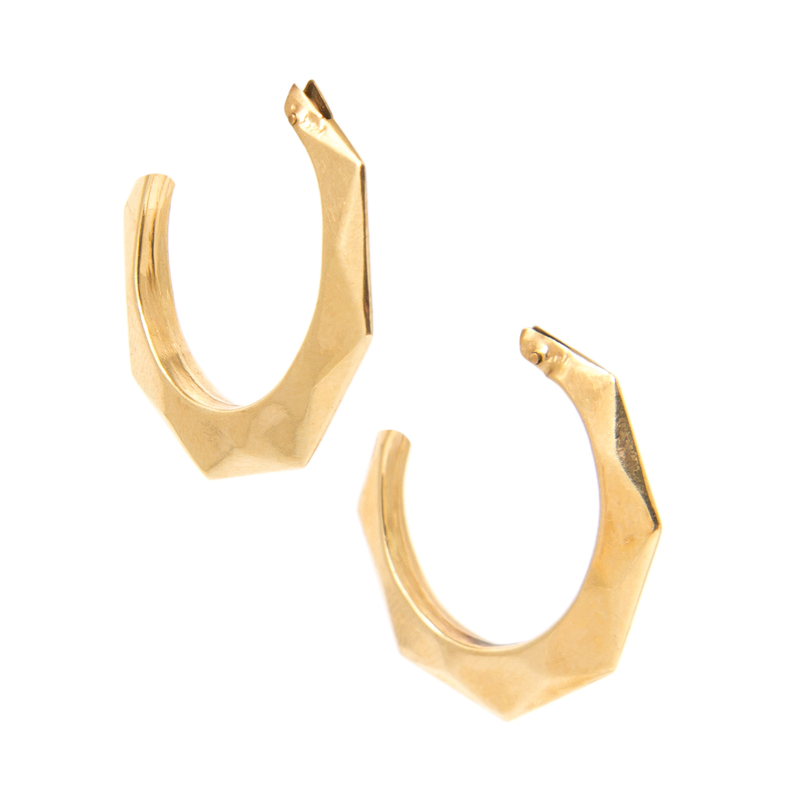 consisting of one pair of 14 karat gold half hoop fluted earclips, a pair of 18 karat gold textured hoop earrings, a pair of 14 karat gold faceted hoop earrings, a pair of 14 karat gold and white enamel earclips in a curved dome pattern, a pair of gold and mother-of-pearl hoop earrings, a pair of gold and onyx hoop earrings and a pair of 14 karat gold happy face earrings with a happy face tietac.
