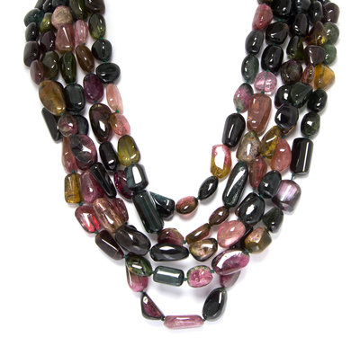 consisting of five strands of freeform shape tourmaline beads in various hues of green, pink, and yellow, strung knotted with a gold tone clasp.