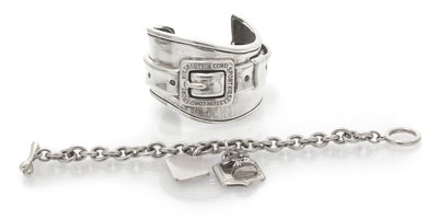 consisting of a charm bracelet containing a blank dog tag charm and a shield dog charm with dog bone toggle clasp, together with a cuff bracelet with a belt buckle design. Charm bracelet stamp: KIESELSTEIN-CORD 1995 925.Cuff bracelet stamp: KIESELSTEIN-CORD SPORT 1996 925.