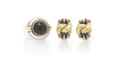 consisting of a ring containing one round cabochon cut onyx measuring approximately 12.00 mm in diameter, together with a pair of yellow gold and silver curb knot motif earclips.Ring stamp: 925 750 Caviar.Earclip stamp: Caviar 925 750.