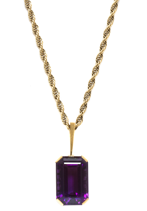 consisting of a pendant containing one octagonal step cut amethyst measuring 17.46 x 25.75 x 13.56 mm, a ring containing one octagonal step cut amethyst measuring 16.98 x 13.09 x 10.62 mm and a pair of screwback earrings containing two octagonal step cut amethysts measuring 9.49 x 5.52 mm each.