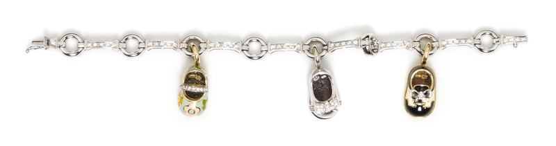 consisting of a circular and bow tie shape link bracelet containing 40 round brilliant cut diamonds weighing approximately 0.40 carat total, together with two yellow gold and one white gold shoe motif charms, the yellow gold charms accented in polychrome enamel, all three charms containing numerous round brilliant cut diamonds weighing approximately 0.15 carat total.Bracelet stamp: AARON BASHA.Charm stamps: (Maker's mark for Aaron Basha) (Italian maker's mark 1248 AL) 750.