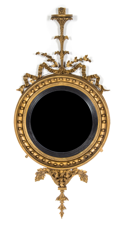 having a foliate and ribbon carved crest above the convex plate within a spherical decorated frame.