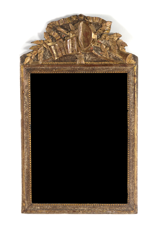 having a rectangular mirror plate within a conforming frame surmounted by a musical trophy and a ribbon crest.