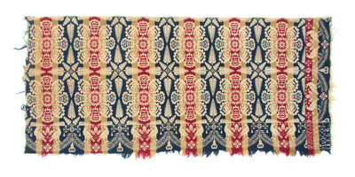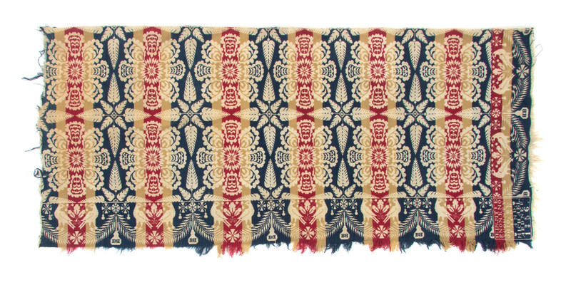 having a repeating geometric design on a navy blue, mustard and red reserve, signed Jacob and Michael Ardner, Mount Vernon, Ohio, 1856.