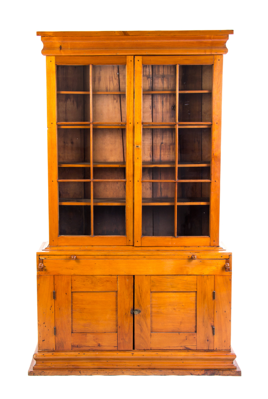in two parts, the upper section having a molded cornice over two glazed doors, the lower section having a writing slide above two cupboard doors, raised on a molded plinth base.