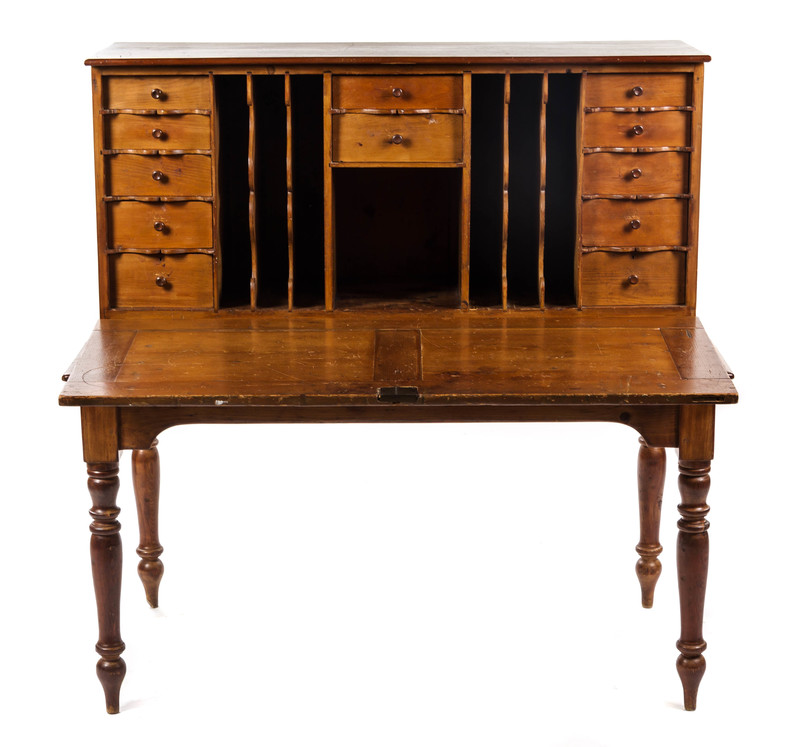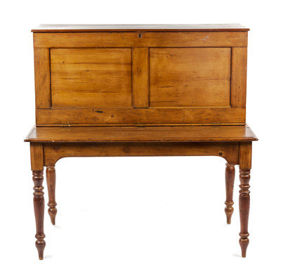 having a rectangular top over the fall front opening to a fitted interior with a series of drawers and niches, the lower section with a hinged lidded compartment, raised on turned legs.