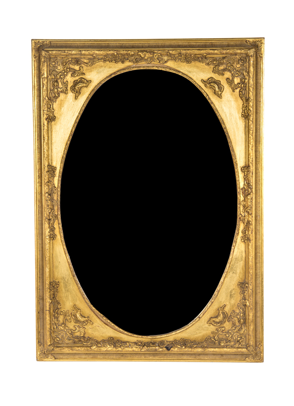 having an oval plate within a rectangular carved frame.
