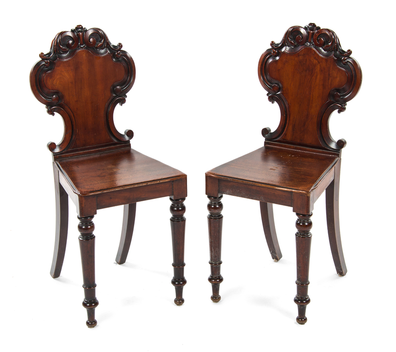 each having a foliate scroll carved back and plank seat, raised on cylindrical turned fore-legs.