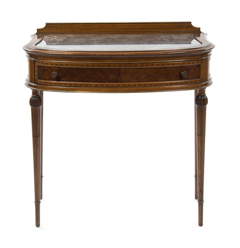 having a shaped marble inset top over a single frieze drawer, raised on fluted cylindrical tapering legs.