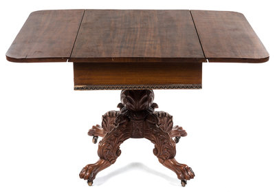 having a rectangular top over the D-shaped leaves, set on a foliate carved standard and raised on foliate carved legs ending in paw feet and casters.