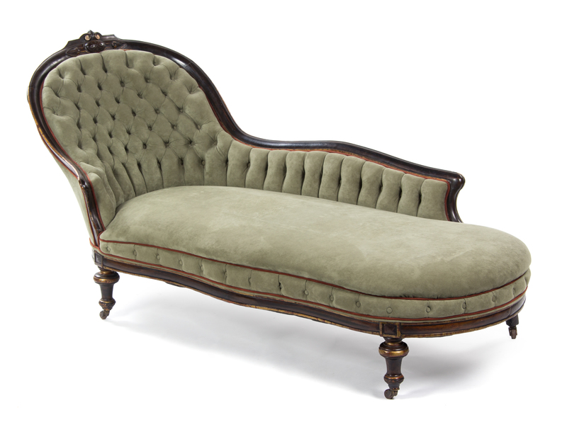 having a button tufted back over a shaped seat, raised on toupie legs ending in casters.
