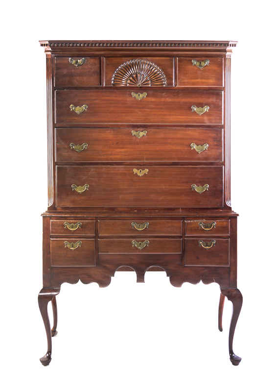 in two parts, the superstructure with a dentiled cornice and canted front corners over three short and three graduated long drawers, the base fitted with a series of six drawers over the shaped skirt and pendant finial, raised on cabriole legs.